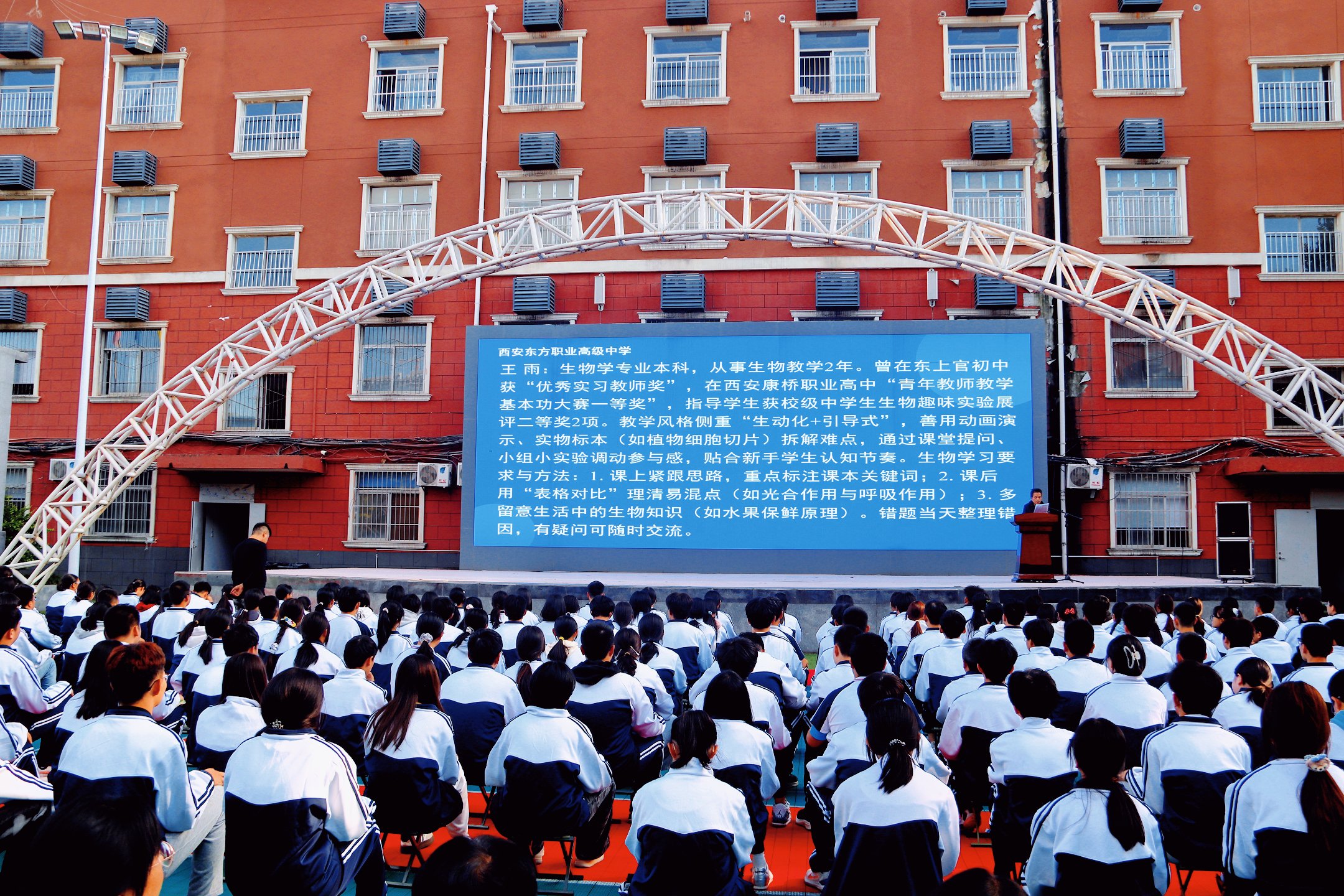 9 月 19 日下午第7和8节课(16:25~18:00),西安东方职业高级中学校园内暖意融融,高一师生齐聚小操场,共同参与主题学习方法分享大会。本次活动由教务处副处长宋涛老师 倾情主持,旨在通过师长引领破解学习难题,以习惯养成为学业护航,为新学期教学工作筑牢根基。